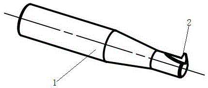 如圖1-2所示,一種整體硬質合金刀具,包括圓柱形的刀具本體1和刀尖2,刀具本體1和刀尖2由硬質合金制成,刀具本體1左側為圓柱形、右側為錐形,錐形直徑不大于圓柱形直徑。